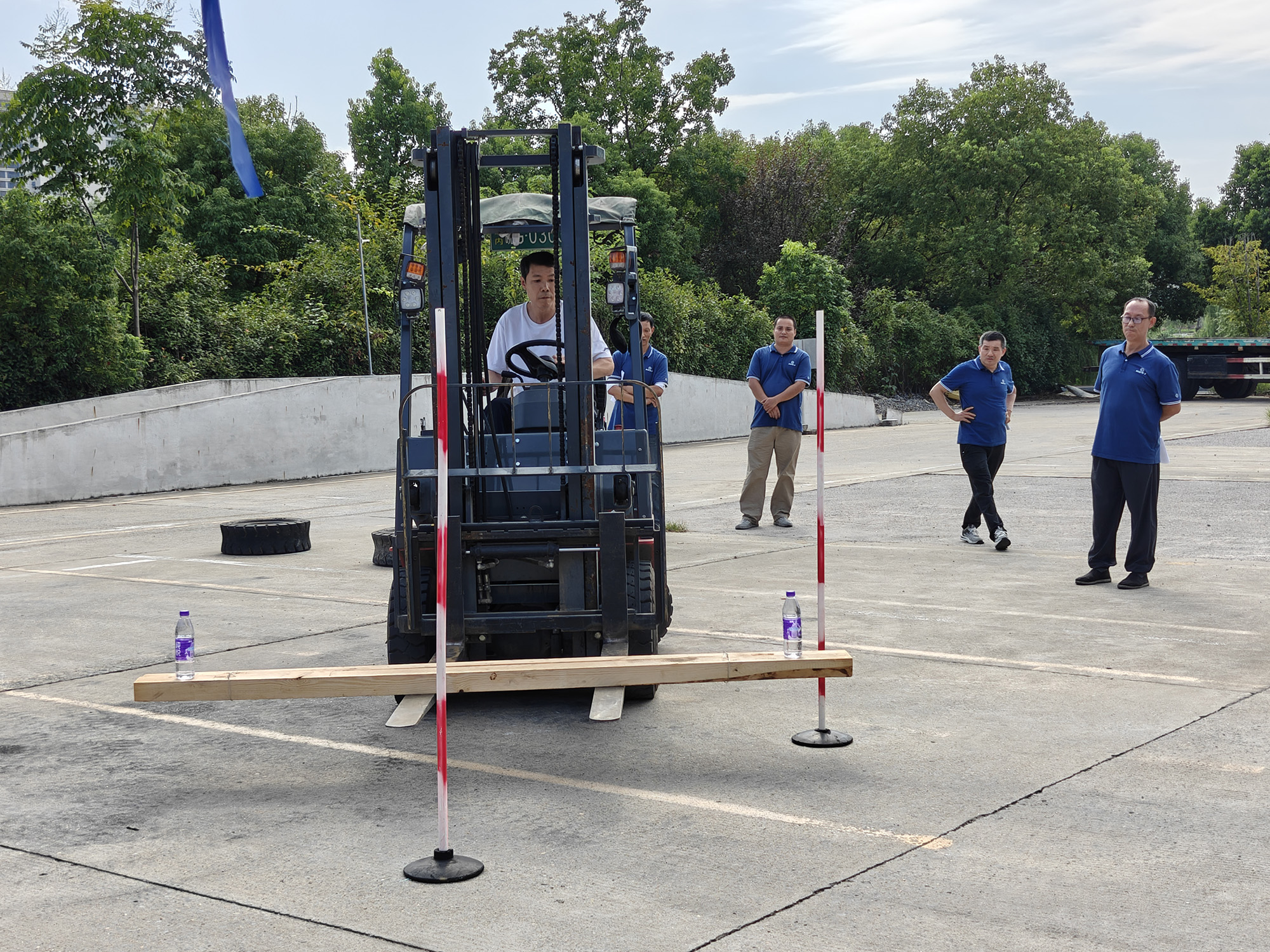 叉車技能比武側(cè)重于選手的操控熟練性與心理素質(zhì)。項目設(shè)置緊密貼合實際作業(yè)場景,要求選手在限定時間內(nèi)完成轉(zhuǎn)向往返、托盤精準移庫碼放等動作,并在繞障礙物操作過程中確保托盤上礦泉水瓶保持穩(wěn)定,不得掉落。競賽不僅要求速度,更注重操作的平穩(wěn)性與準確性,充分體現(xiàn)出高標準的作業(yè)要求。