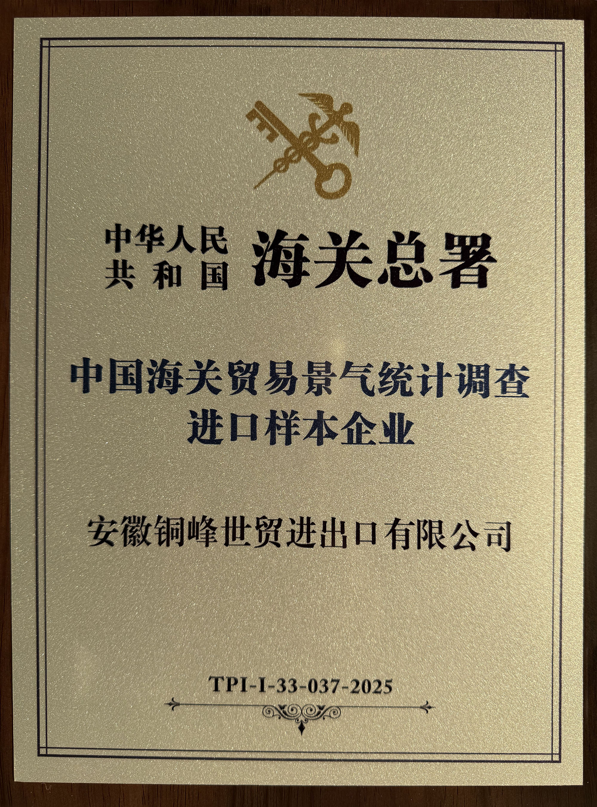 近日,公司全資子公司安徽銅峰世貿(mào)進出口有限公司憑借其卓越的進出口業(yè)績、規(guī)范嚴(yán)謹?shù)慕?jīng)營管理以及高質(zhì)量的統(tǒng)計申報數(shù)據(jù),成功獲得海關(guān)總署授予的“中國海關(guān)貿(mào)易景氣統(tǒng)計調(diào)查進口樣本企業(yè)”榮譽稱號。